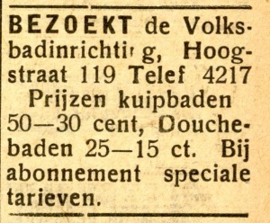 In 1934 opende kappersbedrijf J. van Tuyl-Stoker in het pand Hoogstraat 119 de Eerste Eindhovensche Volksbadinrichting. Al spoedig bleken de faciliteiten te gering voor de 250 bezoekers die er (volgens de krant) elke week gebruik van maakten. Het bedrijf werd daarom uitgebreid met tien cabines en telde toen zeven kuipbaden en elf douches. Van Tuyl was op werkdagen geopend van 9.00 tot 20.00 uur, op zaterdag van 9.00 tot 23.00 uur en op zondag van 9.00 tot 11.00 uur. Voor het gebruik van een kuipbad rekende hij 40 cent en voor een "sproeibad" 20 cent. Een jaar later waren de tarieven al weer verhoogd: kuipbaden kostte 50-30 cent, douchebaden 25-15 cent.