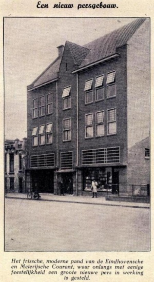 Het nieuwe pand van de Meierijsche Courant, gebouw in 1929-1930 met adres Wal 2-4. Het pand is later in 1961/1962 afgebroken en vervangen door het kantoor van het Eindhovens Dagblad.